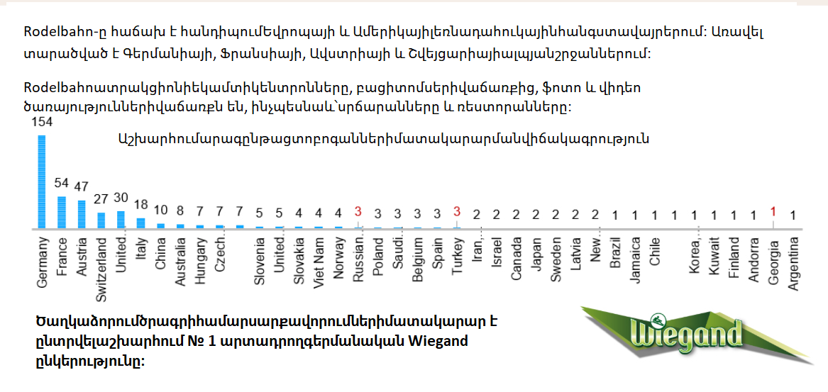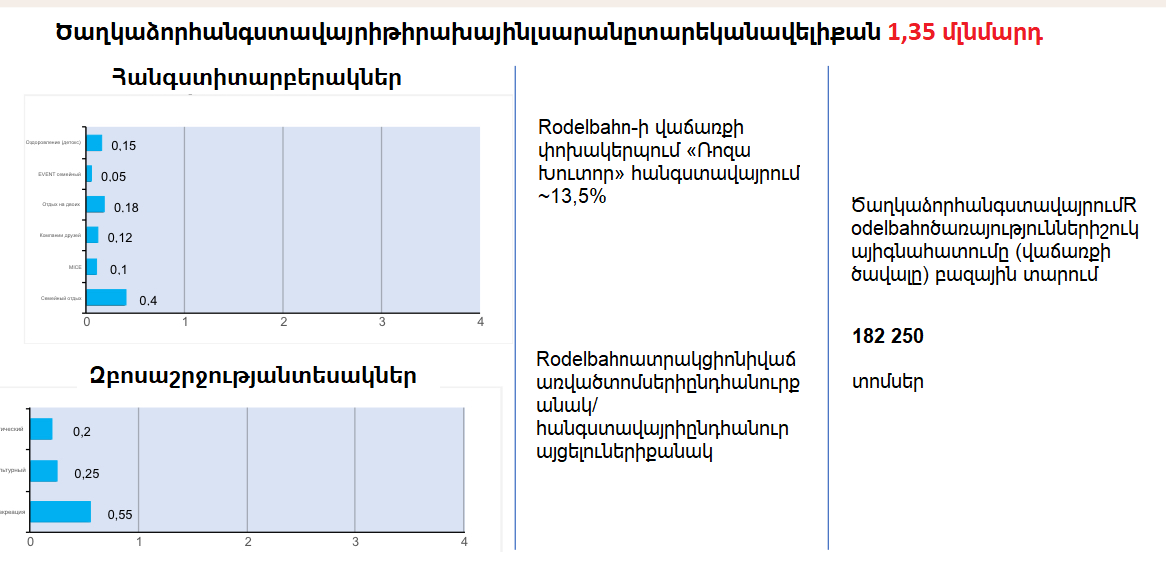 Ծաղկաձոր քաղաքում ակտիվ հանգստի համար նոր օբյեկտի ստեղծում. արագընթաց տոբոգանի մոնոռելսային ուղի - Rodelbahn ատրակցիոն (նախագծի 1-ին փուլ), ինչպես նաև լեռներում թեմատիկ գեղատեսիլ ռեստորան (նախագծի 2-րդ փուլ):